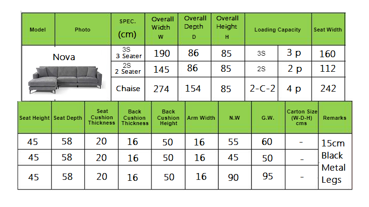 | Overall Width – 3 Seater | 2 Seater | 190  |  145  |